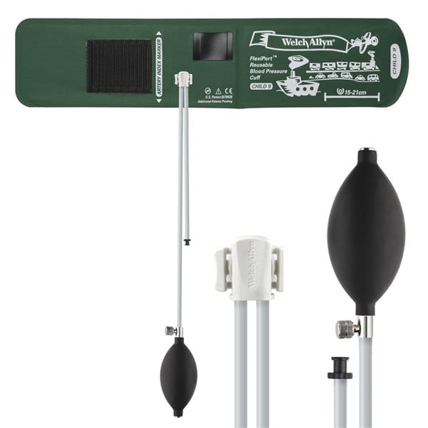 Cuff Blood Pressure FlexiPort 15-21cm Child Size 9 Arm Green Tri-Purpose Connector 2-Tube Nylon Hook & Loop Closure Rotatable Port Non-Sterile Reusable Not Made With Natural Rubber Latex 1 Piece With 2-Tube Inflation System Each