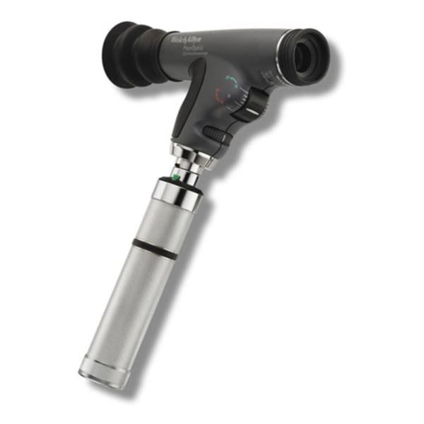 The revolutionary PanOptic provides easy entry into the eye, together with a wider field of view to more easily observe conditions such as hypertension, diabetic retinopathy, and papilledema. Features & Benefits: • Fast, easy entry into undilated pupils • 5x larger view of the fundus vs. standard ophthalmoscopes in an undilated eye • 25 degree field of view vs. the standard 5 degree field of view • Greater working distance improves comfort for both practitioner and patient • Helps detect corneal abrasions with cobalt blue filter and corneal viewing lens (model 11820 only) • Patented Glare Extinguishment System prevents interference from unwanted glare and reflections • Halogen HPX™ lamp provides bright, white light • Compatible with all existing Welch Allyn 3.5 V power sources