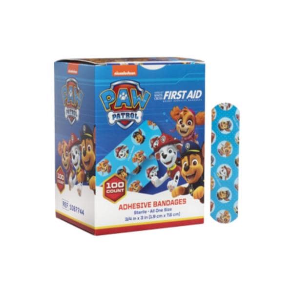 Bandage Adhesive Strip Printed Polyethylene Film 3/4x3" American White Cross First Aid Stat Strip Non-Adherent Pad Breathable Highly Absorbent Flexible 100 Count Not Made With Natural Rubber Latex Paw Patrol 100/Box, 12 BX/CA