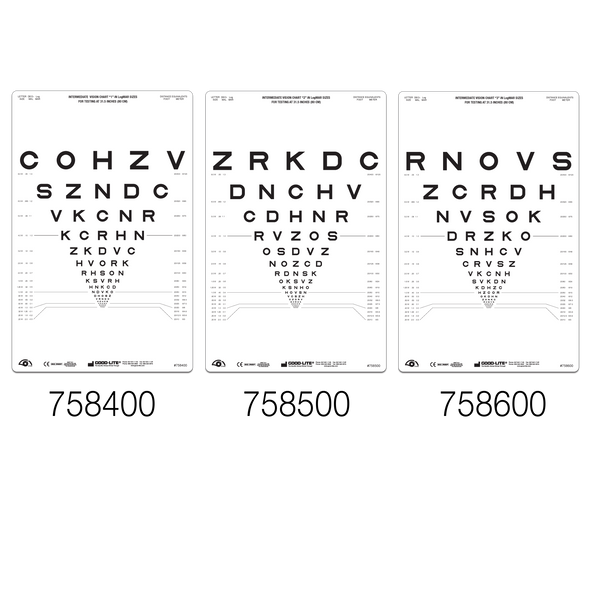 These Sloan Letter charts are calibrated to test visual acuity at an intermediate distance of 80 cm (31 in.). The Sloan Letter optotypes are on proportionally spaced lines; line sizes range from 20/400 to 20/10 (6/120 to 6/3) equivalent. Available in 3 different scrambled versions for repetitive testing situations.