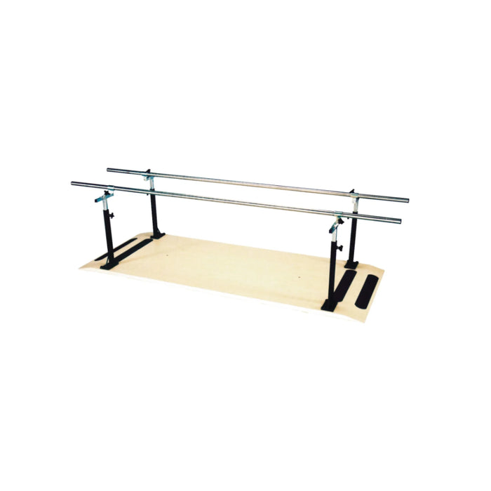 The AM-707 7' Platform Mounted Parallel Bars have stainless steel handrails that have a 1-1/2 diameter, a slip-resistant laminated platform, and posi-Lok locking knobs. These handrails are great for rehabilitation or leg, back, or spine injuries where the patient needs to learn or practice walking. The ability to adjust these handrails makes this a versatile product that can accommodate patients of different ages and heights.