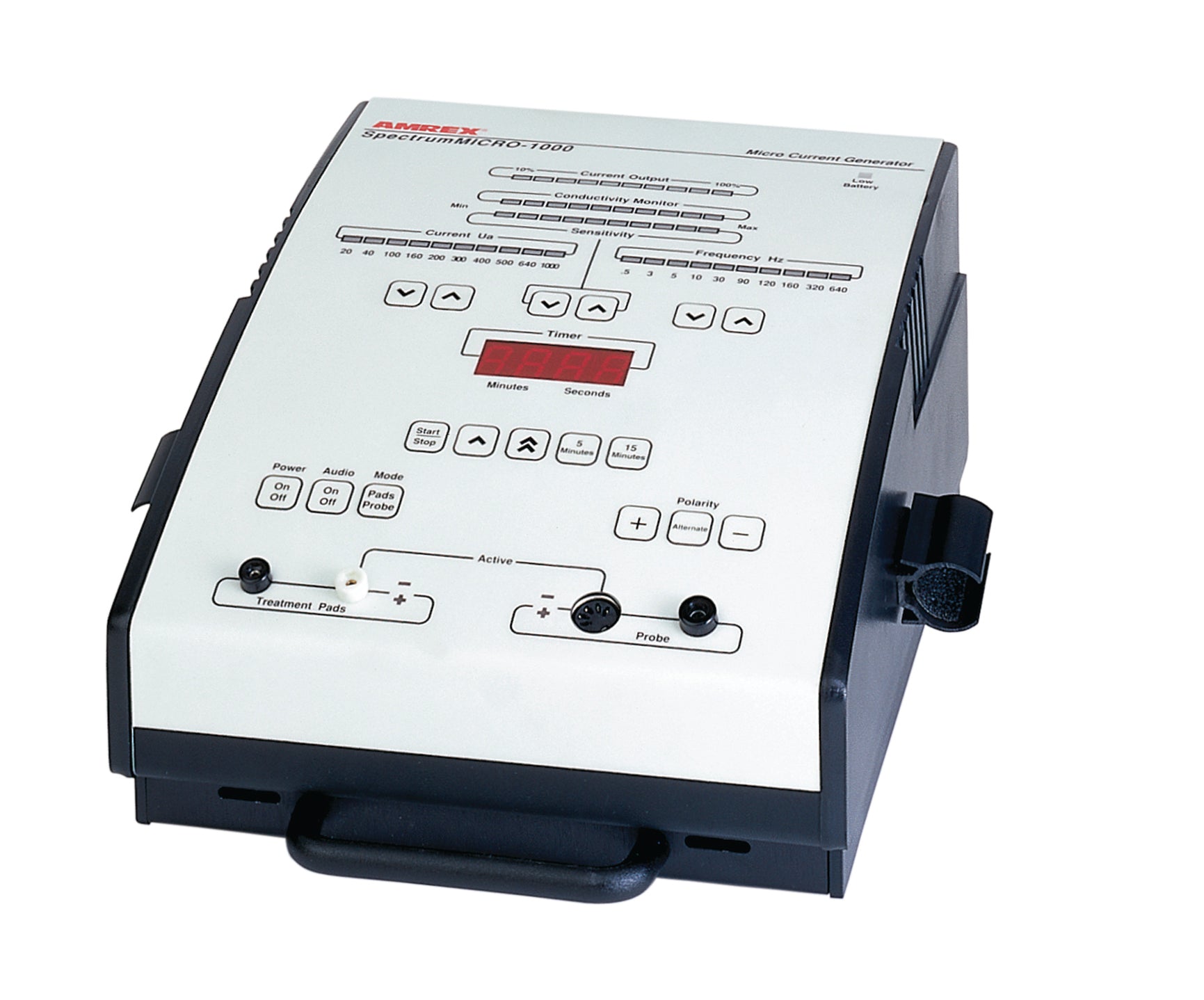 Single channel MC1 micro-current stimulator provides easy to use treatment protocol. Spectrum MC1 micro-current stimulator provides easy to use treatment protocol. Intensity (20-1000 mA), frequency (0.5 - 620 MHz) and polarity are variable. Used with pads or probe (both included). Use AC power or battery pack.