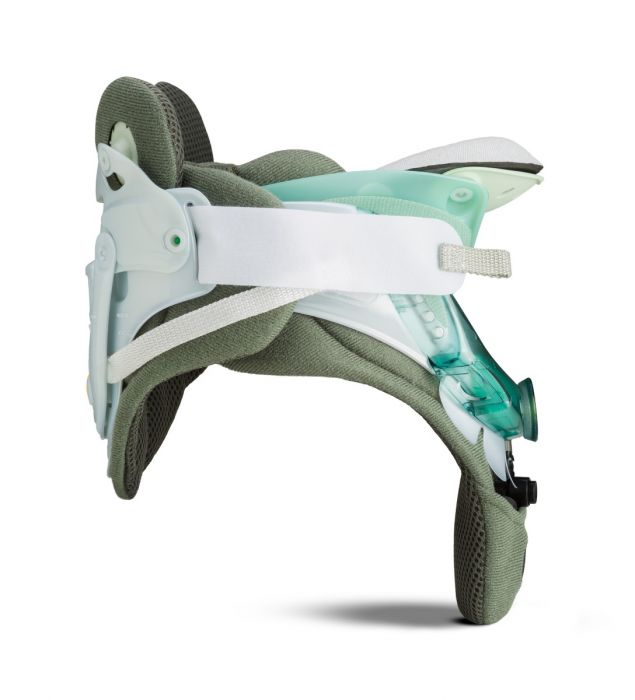 Locking Strap on the left side is adjusted during the initial fitting then left in that position so the patient can achieve the proper tightness and positioning when the collar is reapplied at home.