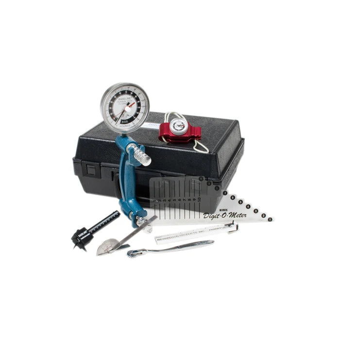 Necessary to measure hand strength and range of motion, the Evaluation set comes in a portable carrying case with all the needed instruments.