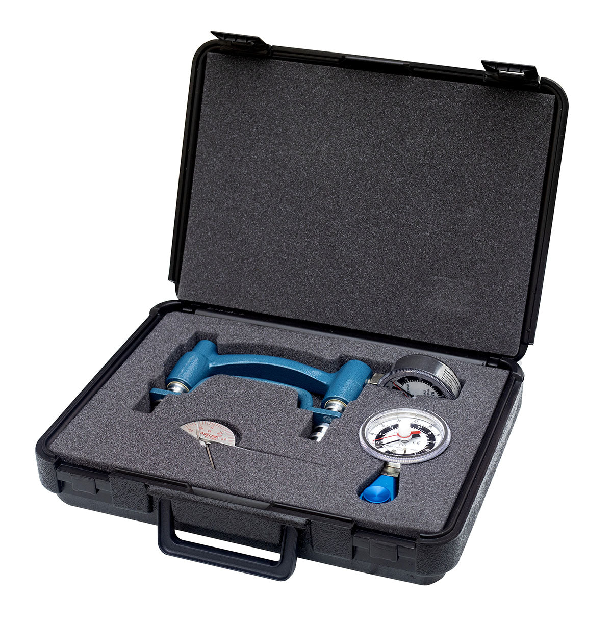 Baseline 3-piece standard hand evaluation set includes the following instruments stored in a protective carrying case: standard 200 pound capacity hydraulic hand dynamometer (blue), standard 50 pound capacity hydraulic pinch gauge (blue), and 6 inch stainless steel finger goniometer. Dynamometer and pinch gauge have a 2 year manufacturer's warranty. CE Certified.
