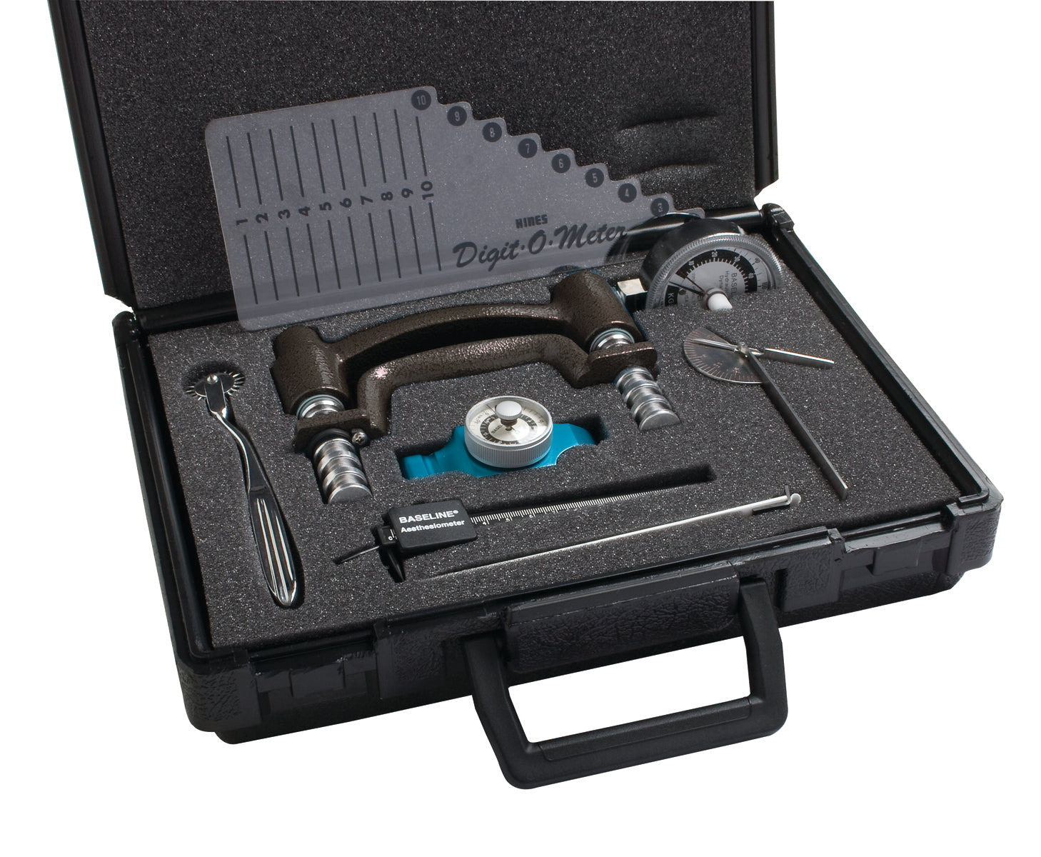 Baseline 7-piece HD hand evaluation set includes the following instruments stored in a protective carrying case: standard 200 pound capacity hydraulic hand dynamometer (black), 30 pound capacity mechanical pinch gauge (blue), 6 inch stainless steel finger goniometer, 2-point discriminator with 3rd point, Wartenburg pinwheel, finger circumference gauge and functional finger motion gauge. Dynamometer and pinch gauge have a 5 year manufacturer's warranty. CE Certified.