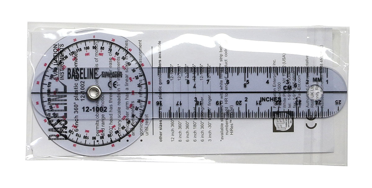 This transparent plastic goniometer permits observation of a joint's axis of motion and its range of motion. The primary purpose of this device is to assist in physical therapy by determining range of motion of a joint as well as evaluating and gauging recovery after surgery or physical therapy. The 360? head has three scales calibrated to be used with the ISOM (International Standards of Measurement, STFR) system. This is an essential tool for treatment, rehab and surgical recovery and evaluation. Suitable for home use as well as multi-user environments. The arms are 6". This goniometer lets you measure joint limits and range-of-motion as well as check extension, flexion, abduction, adduction and rotation. The arms have a linear scale in both inches and centimeters. They also will remain at the last measurement position until reset. The 360? angle scale reads 1? increments. The clear plastic of the goniometer allows the device to be placed directly and exactly on a joint or limb for easy observation. This Goniometer is a Baseline product, which means it's a trusted name in measurement and evaluation instruments. Baseline products have been used by Medical Professionals, Therapists, Doctors and Rehab Clinics all over the world since 1974. If you have ever received therapy after an injury, you have probably had your progress tested and measured with a Baseline measurement instrument.