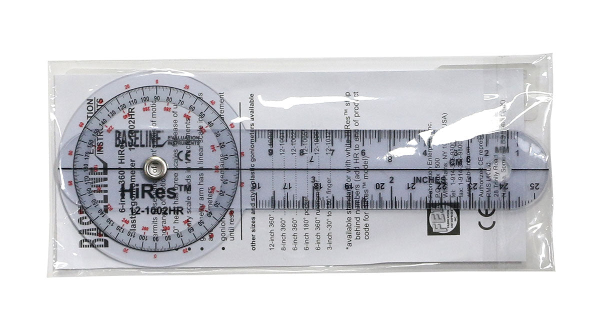 This transparent plastic goniometer permits observation of a joint's axis of motion and its range of motion. The unique design adds a white line behind the measurement gradations to make the readings even easier to read. The primary purpose of this device is to assist in physical therapy by determining range of motion of a joint as well as evaluating and gauging recovery after surgery or physical therapy. The 360? head has three scales calibrated to be used with the ISOM (International Standards of Measurement, STFR) system. This is an essential tool for treatment, rehab and surgical recovery and evaluation. Suitable for home use as well as multi-user environments. The arms are 6"". This goniometer lets you measure joint limits and range-of-motion as well as check extension, flexion, abduction, adduction and rotation. The arms have a linear scale in both inches and centimeters. They also will remain at the last measurement position until reset. The 360? angle scale reads 1? increments. The clear plastic of the goniometer allows the device to be placed directly and exactly on a joint or limb for easy observation. This Goniometer is a Baseline product, which means it's a trusted name in measurement and evaluation instruments. Baseline products have been used by Medical Professionals, Therapists, Doctors and Rehab Clinics all over the world since 1974. If you have ever received therapy after an injury, you have probably had your progress tested and measured with a Baseline measurement instrument.