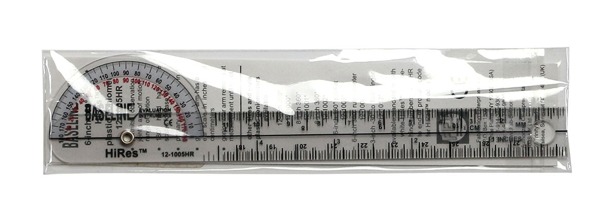 This transparent plastic goniometer permits observation of a joint's axis of motion and its range of motion. The unique design adds a white line behind the measurement gradations to make the readings even easier to read. The primary purpose of this device is to assist in physical therapy by determining range of motion of a joint as well as evaluating and gauging recovery after surgery or physical therapy. The 180? head has three scales calibrated to be used with the ISOM (International Standards of Measurement, STFR) system. This is an essential tool for treatment, rehab and surgical recovery and evaluation. Suitable for home use as well as multi-user environments. The arms are 6"". This goniometer lets you measure joint limits and range-of-motion as well as check extension, flexion, abduction, adduction and rotation. The arms have a linear scale in both inches and centimeters. They also will remain at the last measurement position until reset. The 180? angle scale reads 1? increments. The clear plastic of the goniometer allows the device to be placed directly and exactly on a joint or limb for easy observation. This Goniometer is a Baseline product, which means it's a trusted name in measurement and evaluation instruments. Baseline products have been used by Medical Professionals, Therapists, Doctors and Rehab Clinics all over the world since 1974. If you have ever received therapy after an injury, you have probably had your progress tested and measured with a Baseline measurement instrument.