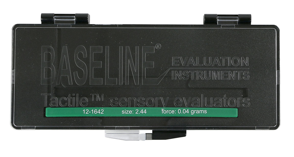 The Baseline tactile monofilament evaluator is used to measure cutaneous sensory perception threshold. Each monofilament represents a unique amount of force and has a fitted protective case enables safe storage and transport.