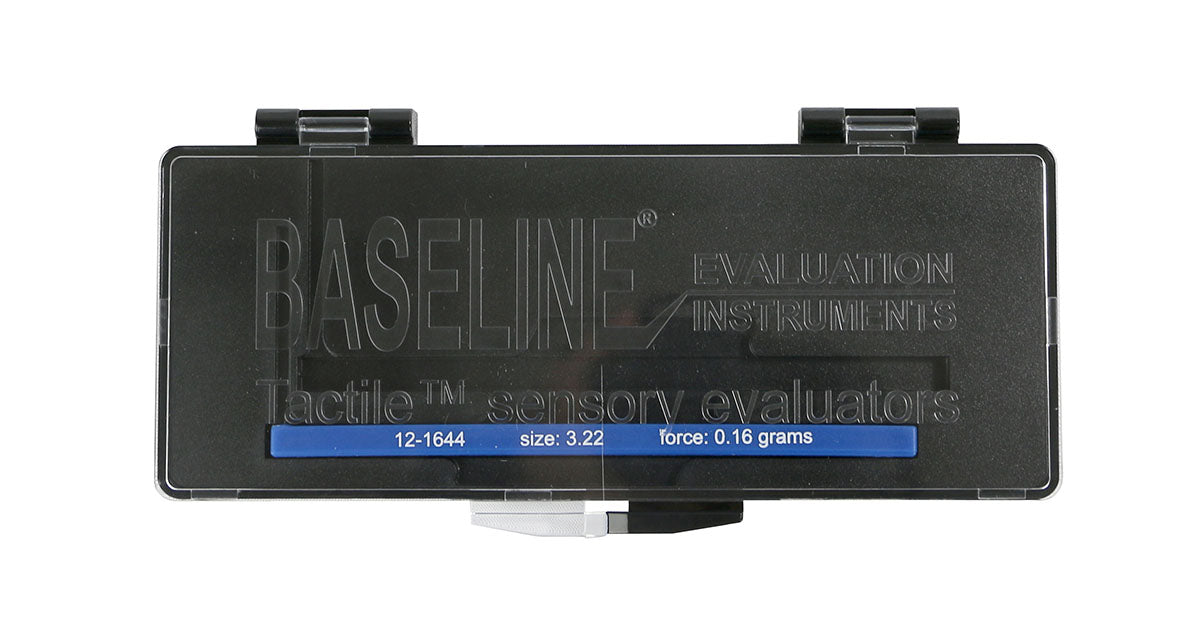 The Baseline tactile monofilament evaluator is used to measure cutaneous sensory perception threshold. Each monofilament represents a unique amount of force and has a fitted protective case enables safe storage and transport.