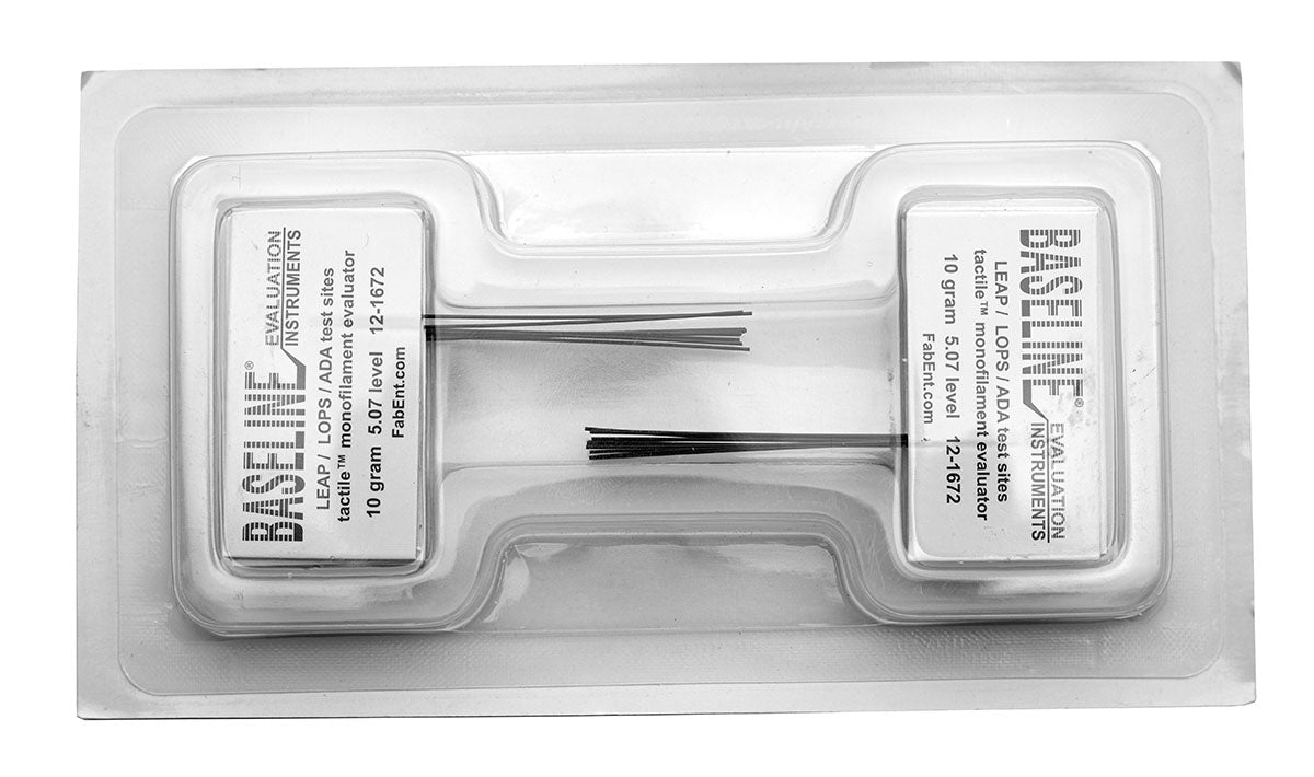 Baseline Tactile Monofilaments are 5.07 disposable monofilaments that each measure 10 grams of pressure. Complete with the ADA, LEAP, and LOPS program testing protocol. Pack of 20 monofilaments.