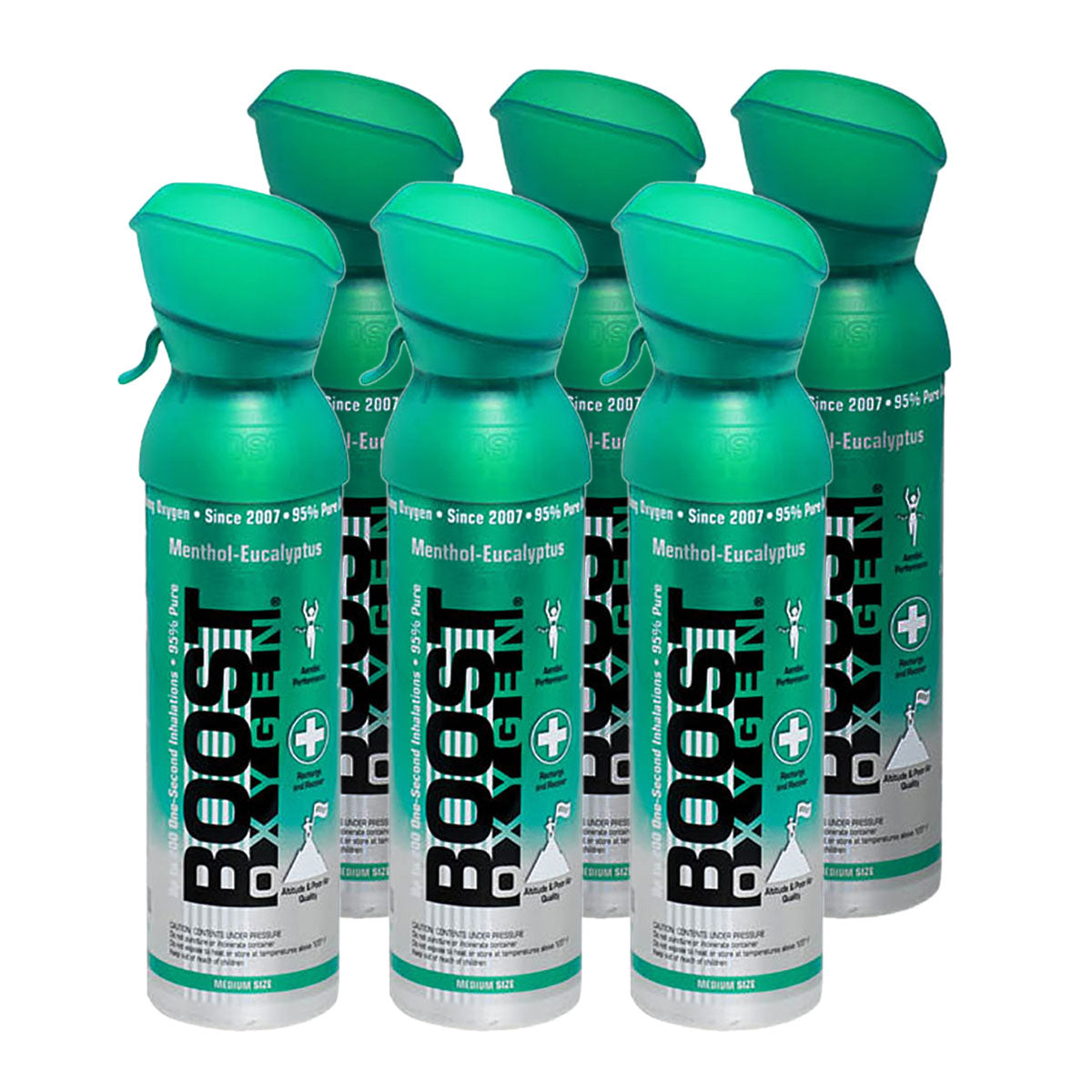 Boost Oxygen ensures you'll never run out of breath again! Oxygen is obviously required to keep us alive and when deprived of oxygen, the body and mind suffer. Boost Oxygen provides a convenient and safe source of 95% pure Aviator's Breathing Oxygen, making access to all-natural and beneficial supplemental oxygen immediate to anyone, anytime, anywhere. Easy to take on the go as Boost comes in conveniently sized aluminum canisters. Boost Oxygen provides pure oxygen in a convenient, non-prescription form. Pro athletes use supplemental oxygen for fast aerobic recovery, natural energy and optimal performance. Unlike stimulants and energy drinks, Boost Oxygen is all natural and safe. Boost Oxygen is manufactured and packaged in the USA.Please note, Boost is not a substitute for individuals who have been prescribed Medical Oxygen (over 99% concentration) for health reasons. It is solely intended for recreational use. The natural oxygen is infused with menthol-eucalyptus for a more cooling flavor. It comes in a 5-liter can for over 100 seconds of inhalations. Case of 6.