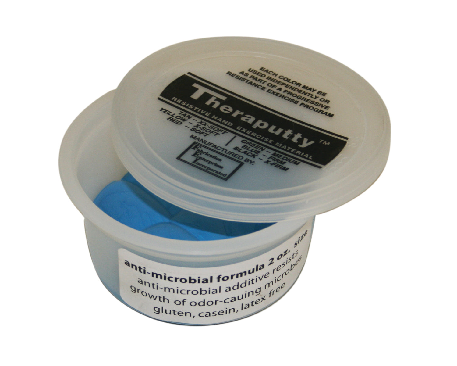 Anti-microbial additive resists growth of odor-causing microbes. Anti-microbial Theraputty material retains the clean, non-greasy feel of original Theraputty material. Each color-coded putty has a different consistency ranging from xx-soft for strengthening the weakest grasp to extra-firm for developing a stronger grip. Available in convenient easy-to-open plastic containers (2, 3, 4 and 6 ounce) for individual patients to use at home and a choice of larger containers (1 and 5 pound) for the hospital or clinic. CanDo Theraputty material is gluten, latex and casein free.