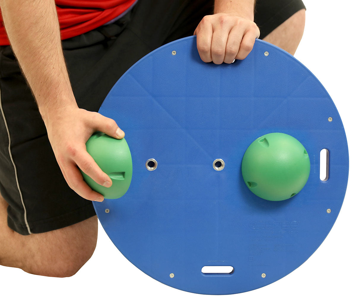 The combination wobble and rocker board can be used to strengthen and condition the lower back, improve ankle ROM, balance, body awareness and develop joint mobility and reaction skills. CanDo Balance Board Combo has handles/slots to add band or tubing. The board is durable, heavy-duty and non-skid yet lightweight and compact for portability. 16" circular wobble/rocker board, with 2 x 2" height, green MVP instability balls.