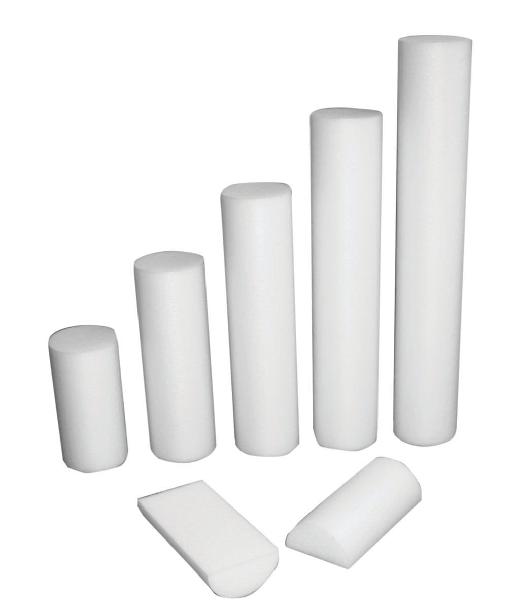 Polyethylene foam rollers are perfect for positioning, balance, postural and muscle re-education, spinal stabilization, body awareness and coordination, and ranging and strengthening activities. Round rollers offer progressive exercise sequences - user can graduate from an easier (smaller diameter) to a more difficult (larger diameter) roller. Half round roller is a great tool for ankle stretching and knee rehabilitation. Diameter refers to the width of the half-round profile. The foam is strong enough to be used by large adults and active children. Foam rollers are available in 48", 36", 30", 24", 18" and 12" lengths and 3", 4", 6" or 8" diameters with either a round (circular) or half-round (semi-circular) profile. Polyethylene foam rollers are available with standard formula in white and blue. They are also available with anti-microbial additive, in beige. 6" x 36" and 6" x 12" half rollers available sliced or fully extruded so that the bottom has an integral skin. Choose the roller that is right for you!