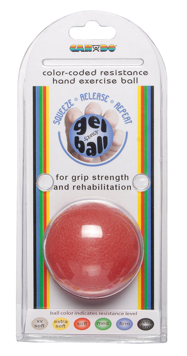 CanDo Gel Squeeze Ball hand exerciser for grip strength, dexterity, mobility, and fine and gross motor skills. Heat or chill for use in hot or cold therapy. Available in 6 color-coded resistance levels. Each level (firmness) available in circular or egg shape. Balls can withstand temperatures ranging from -76 degrees Fahrenheit to 167 degrees Fahrenheit