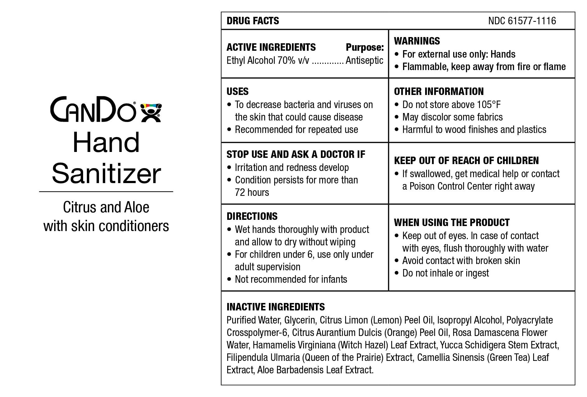 It has never been more vital to ensure your cleanliness. Hand Sanitizer from CanDo does just that and more. This Hand Sanitizer is so effective, it kills 99.9% of the most common illness-causing germs in 15 seconds, including those related to the common cold and flu. Experts repeatedly tell us that common infections are spread directly by hands and touching. CanDo Hand Sanitizer keeps hands clean. Ideal for use prior or just after contact with someone under medical care or treatment. This is a must-have if you're involved in health care, food services, office work or education. This is the one you want as you leave high traffic touchpoint areas as well as public spaces. The Hand Sanitizer dries naturally, so there's no rinsing or towels required. Using repeatedly is encouraged as your hands will be left feeling soft, cleansed and refreshed. To use, just place a small amount of Sanitizer in the palm of the hand and rub your hands together until they are dry. This is a 2 oz. bottle of CanDo Hand Sanitizer. Flip cap keeps bottle securely closed and is terrific for dispensing precise amounts. Moisturizes hands as well as protects them as the Sanitizer contains aloe. 2 oz. container is easy to store and compact enough to fit in a pocket or purse. Water is not required after use. Features a pleasing citrus aroma.