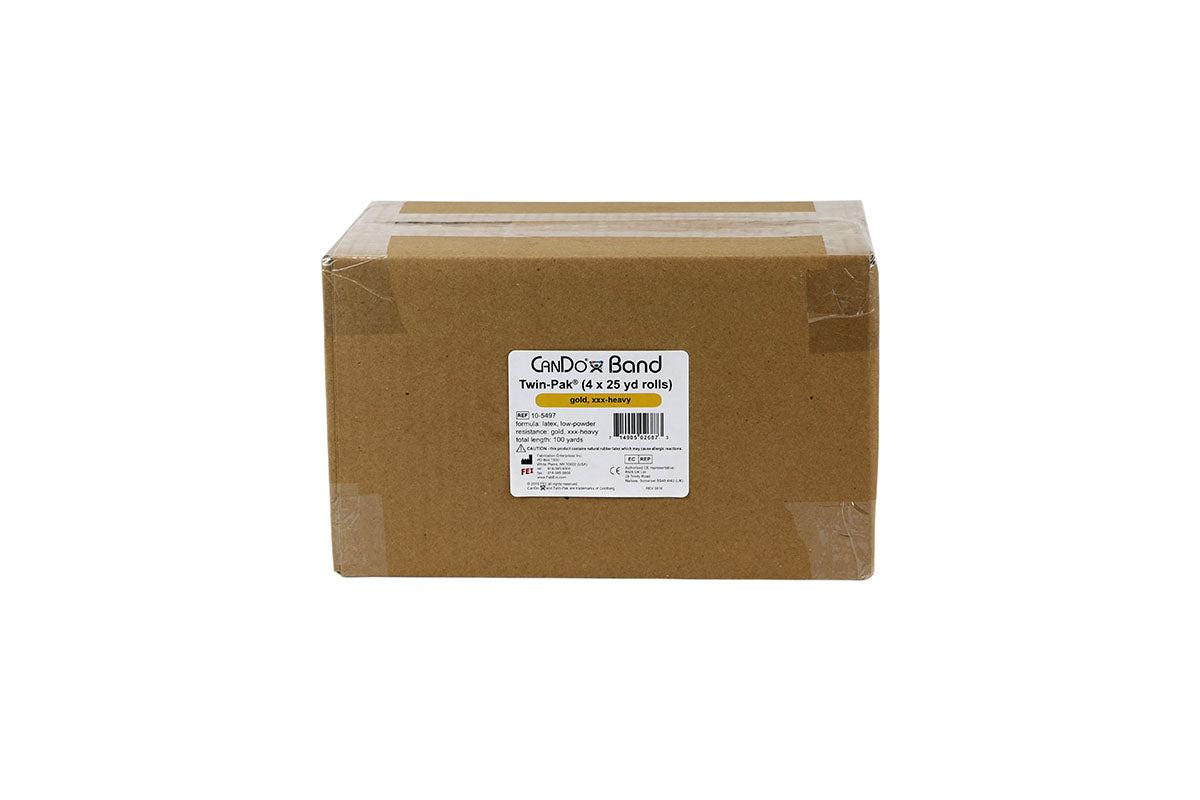 CanDo Rolls of Exercise Bands are perfect for rehabilitation, fitness, physical therapy and athletic training. Additionally, they are great for anyone using them for stretching, muscle toning, improving balance and conditioning all major muscle groups. Packaged in a dispenser box, simply unroll the desired length of exercise band from the box and cut with scissors. The CanDo Exercise Band is the premium exercise band solution, containing natural rubber Latex and all the functionality, stretchability and benefits that come with it. So versatile, these bands are super for upper and lower body exercises that are simple, easy to do and can be performed anywhere. Lightweight, compact and portable, the high quality and superior characteristics of these bands are why they are used in physical therapy and athletic training by clinics, fitness centers and individuals nationwide. This is 100 Yards (2 x 50 Yards) of the Gold (XXX Heavy) Band. Exercise bands are effective when used alone or with handles and anchors. Made with natural rubber Latex which may cause allergic reactions. They are a well-known staple of most physical therapy offices, clinics and gyms because they are durable, powderless and textured for easy gripping. The 50-yard rolls come ready to use in a dispenser box. Bands are available in 8 levels of resistance for progressive exercise. Levels range in order of strength from least to greatest resistance: tan, yellow, red, green, blue, black, silver, gold.