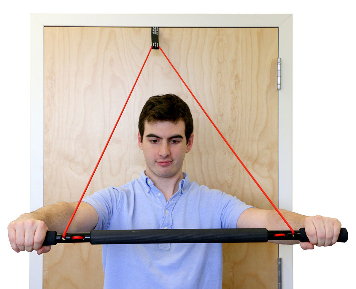 Use CanDo dynamic exercise, tubing and pulley system in the standing or seated position. Exercise superficial muscles and the deeper lying muscles. The exercise bar can be used isometrically and dynamically. X-light resistance, yellow, CanDo exercise tubing is attached to both ends of foam padded exercise bar. Tubing is then attached to swivel-pulley system. The pulley is attached to top of door or in side door jamb by closing the door on the included door anchor. Closing the door creates your instant exercise station.