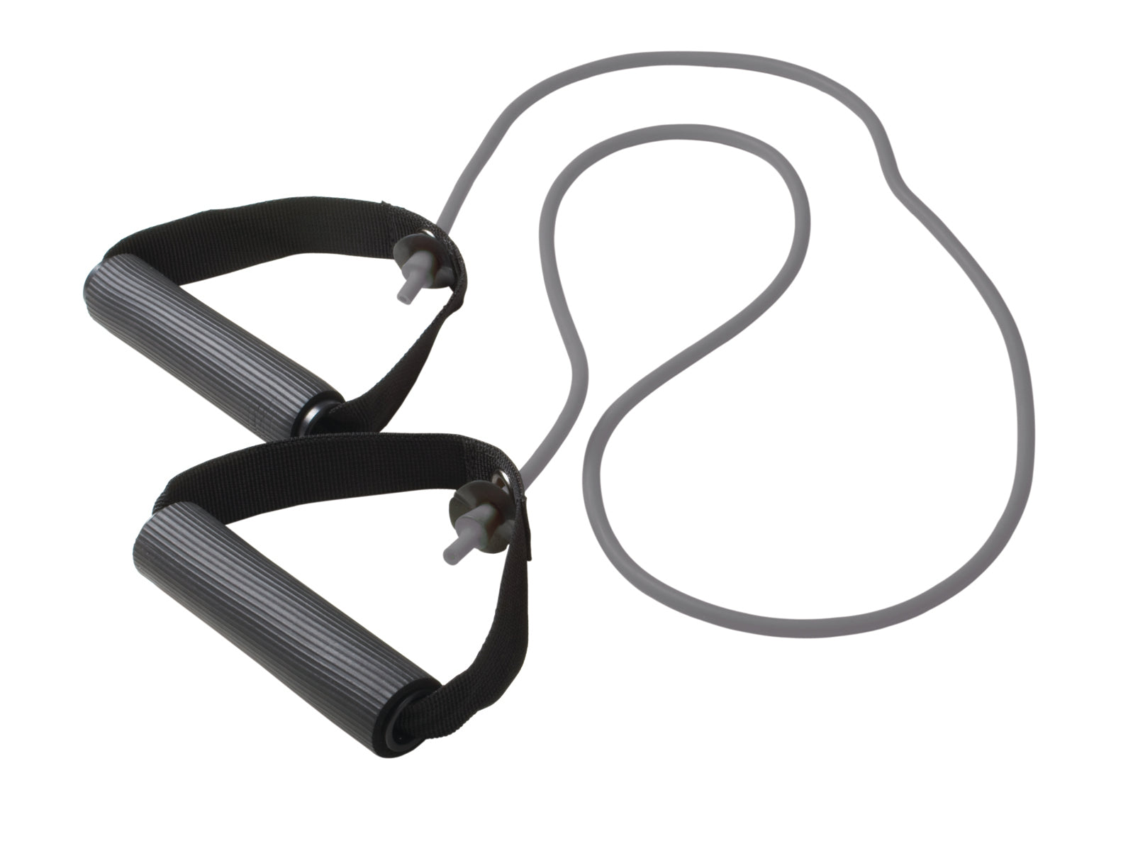 Lightweight, compact and portable, the tubing exerciser helps perform strengthening and conditioning workouts on-the-go, even in your hotel room! Two permanent foam covered rigid handles give the exerciser comfort and a firm grasp. CanDo is licensed to use the Thera-Band color sequence so resistance level is easily identified. The tubing with handles exerciser is available in 7 levels of resistance for progressive exercise and 3 lengths to accommodate different needs. Levels range in order of strength from least to greatest resistance: tan, yellow, red, green, blue, black, silver. Length represents length of tubing from end to end when unit is laid flat and is taut. CanDo low powder exercise tubing is made of natural rubber latex, which may cause allergic reactions.