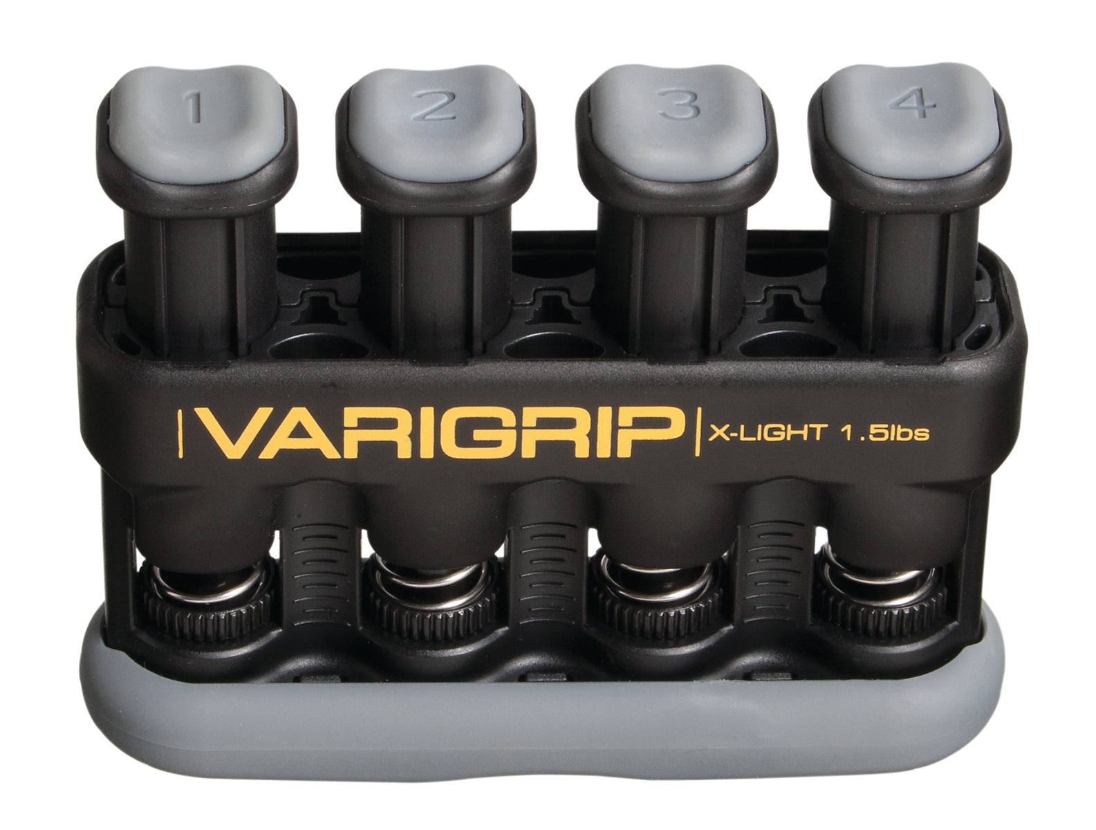 Hand exerciser that allows resistance for each finger to be individually adjusted using the "thumb screw." Palm rest doubles as "full-hand" topper. There are soft finger pads and palm rest. The CanDo VariGrip is great for post-surgery rehab. There are 5 base resistances available, and each base resistance can be modified per finger.