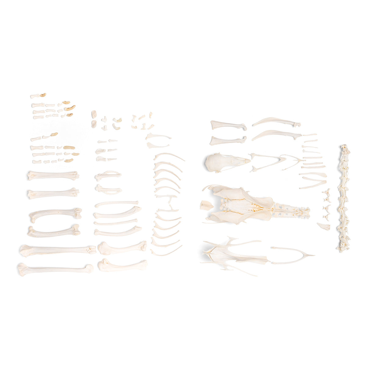 Complete and non-assembled skeleton bones without pre-drilling. Ideal for demonstrating the typical bone structure and anatomy. Small bones can be loose. Does not include building instructions.