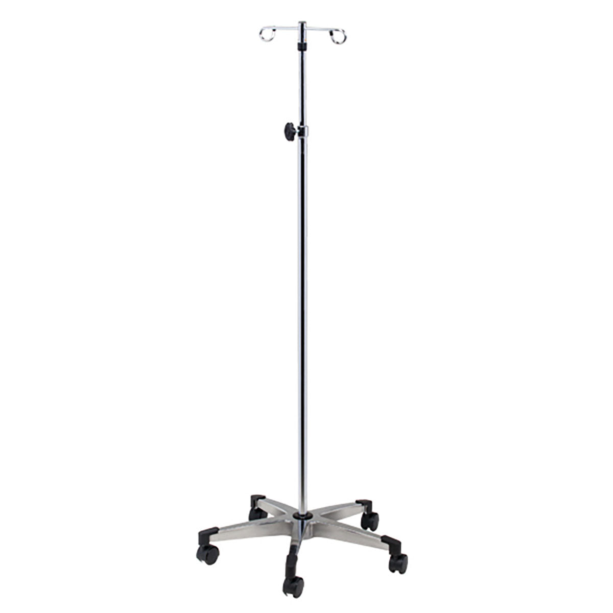 This IV Pole allows patients to remain safely connected to vital medicine. Height adjustable to accommodate patients standing, walking, sitting or lying down, two detachable ram's horn hooks with plastic tips allow for multiple items to be connected at the same time. Suitable for patient rooms as well as operating rooms, this sturdy stand can support up to 45 lbs., making it capable of holding IV fluid packs just as easily as other equipment. The pole is chrome-plated steel for strength and durability while the 5-leg, 23" base is cast aluminum for stability and sturdiness. The soft roll, dual wheel casters allow for easy maneuverability across the room or from room-to-room. Shipped in two boxes, so there is some light assembly required. The stand is height adjustable from 52"-92". Single, ergonomic knob allows for easy height adjustment. The five casters move the pole smoothly over most surfaces including tile, rugs and carpeting. To clean the pole and base, use a soft cloth and gentle cleanser.