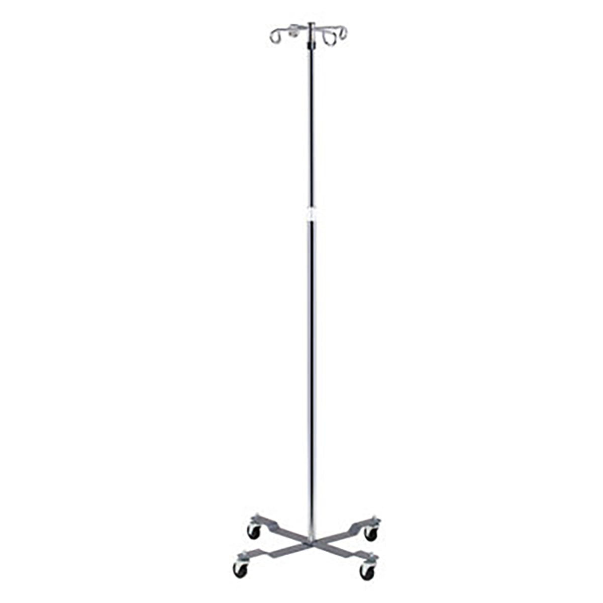 This IV Pole allows patients to remain safely connected to vital medicine. Height adjustable to accommodate patients standing, walking, sitting or lying down, four detachable ram's horn hooks allow for multiple items to be connected at the same time. Suitable for patient rooms as well as operating rooms, this stand can support up to 30 lbs., making it capable of holding IV fluid packs just as easily as other equipment. The pole is chrome-plated steel for strength and durability while the 4-leg, 22" base is made of epoxy-coated steel for unmatched stability. The easy roll, ball bearing casters allow for easy maneuverability across the room or from room-to-room. The base features black bumper guards to help prevent damage. The stand is height adjustable from 46"-83". Features a twist-lock on the pole for easy height adjustment. The four casters move the pole smoothly over most surfaces including tile, rugs and carpeting. To clean the pole and base, use a soft cloth and gentle cleanser.