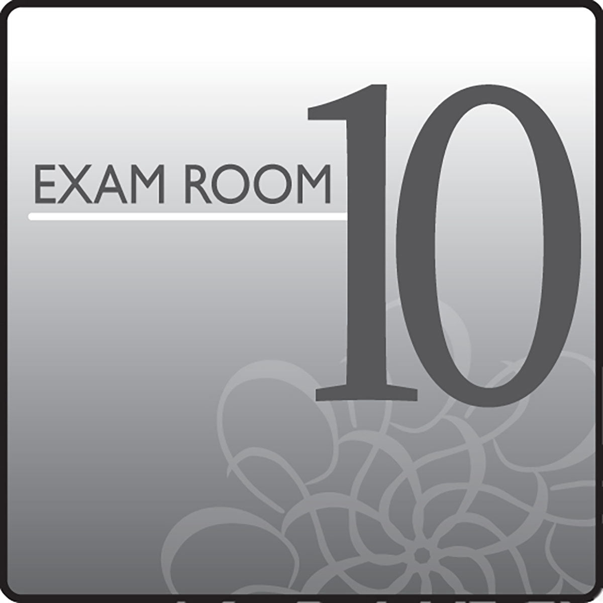 Simple, direct and understated define these Standard Exam Room Signs from Clinton. This Exam Room Sign features dark gray text over a gray background and features a simple geometric pattern. This is an individual sign noting Exam Room 10. All Ocean Series Office Signs are available individually. Durable, each sign is pre-mounted on ridged black plastic. Signs hang easily to any smooth flat surface with the supplied hook and loop strips. Also available as stickers. PLEASE NOTE "STICKER ONLY" when ordering. At a size of 5.5" x 5.5", these signs are large, bright, eye-catching and sure to put children at ease.