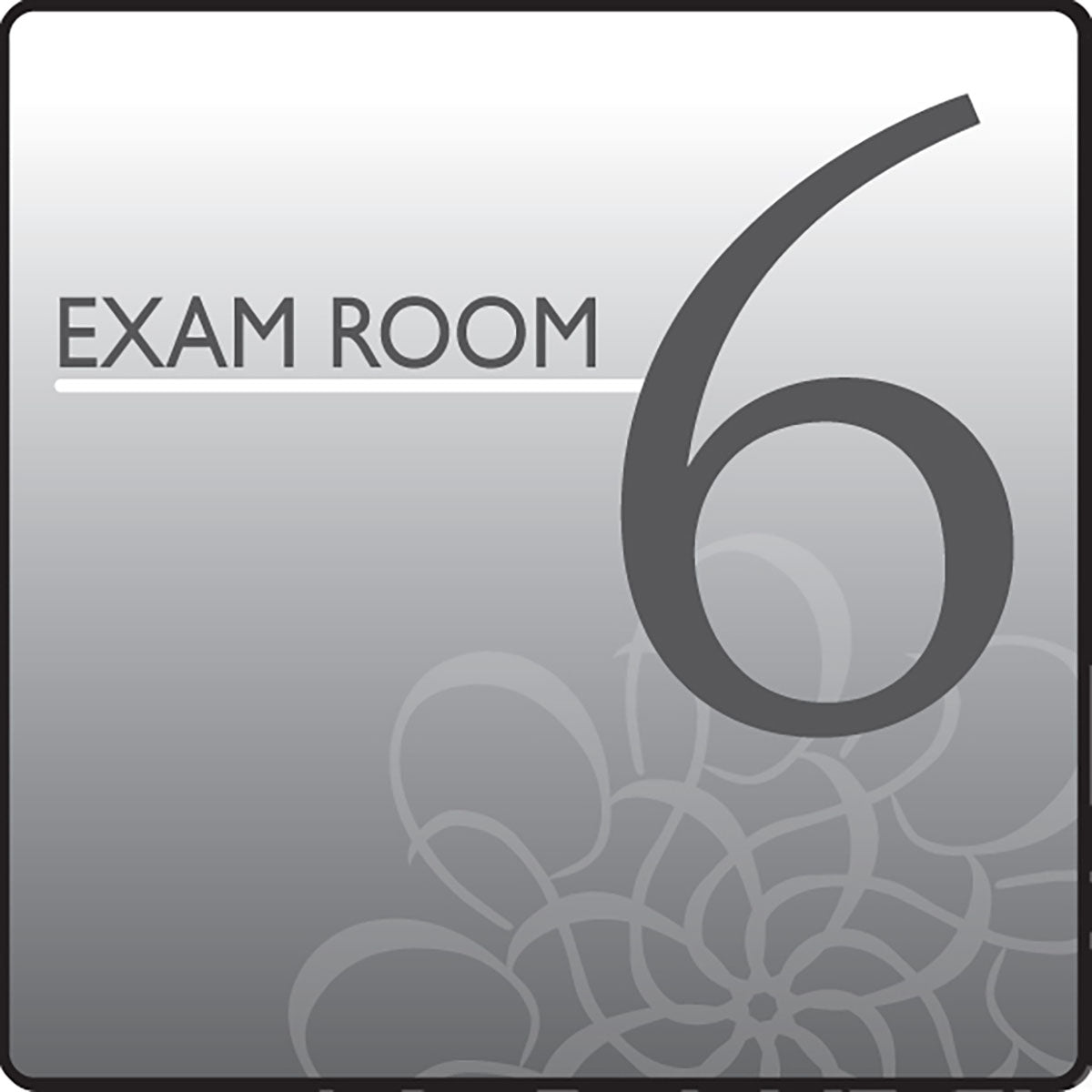 Simple, direct and understated define these Standard Exam Room Signs from Clinton. This Exam Room Sign features dark gray text over a gray background and features a simple geometric pattern. This is an individual sign noting Exam Room 6. All Ocean Series Office Signs are available individually. Durable, each sign is pre-mounted on ridged black plastic. Signs hang easily to any smooth flat surface with the supplied hook and loop strips. Also available as stickers. PLEASE NOTE "STICKER ONLY" when ordering. At a size of 5.5" x 5.5", these signs are large, bright, eye-catching and sure to put children at ease.