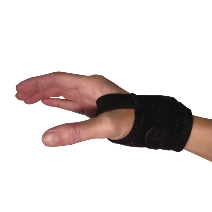 To prevent stress on the basal joint, the support places the thumb in the optimum position. The support abducts the thumb and distracts the CMC joint to give user relief. With a low profile, the support allows users to have normal motion of the thumb while supporting the CMC joint. The pressure dot is applied when more support is desired at the CMC joint.