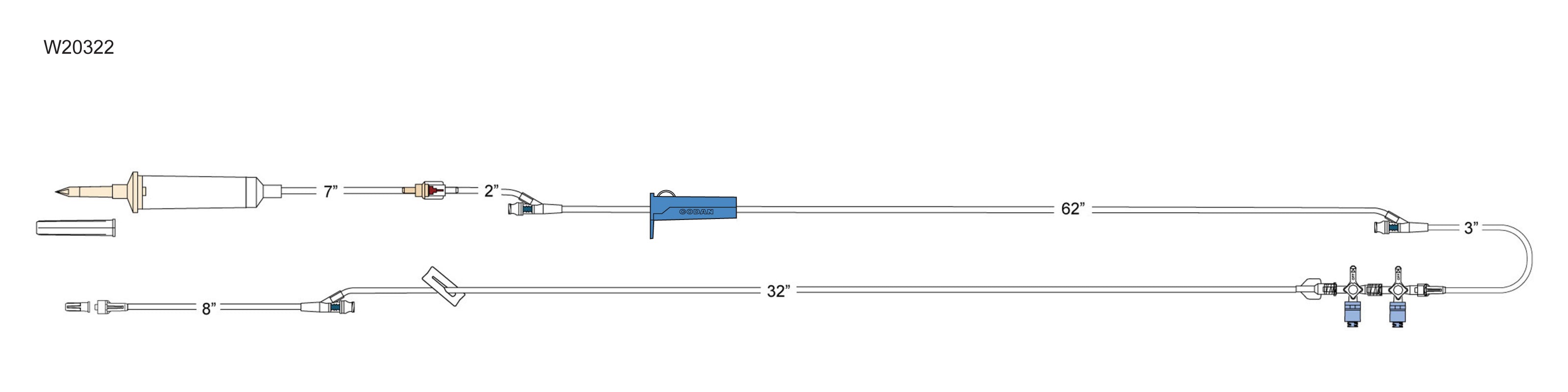 CODAN 10d non-vented chamber, back check valve, (3) needlefree Y-sites, roller clamp, detachable 2-gang swabable four-way stopcocks, male luer-lock