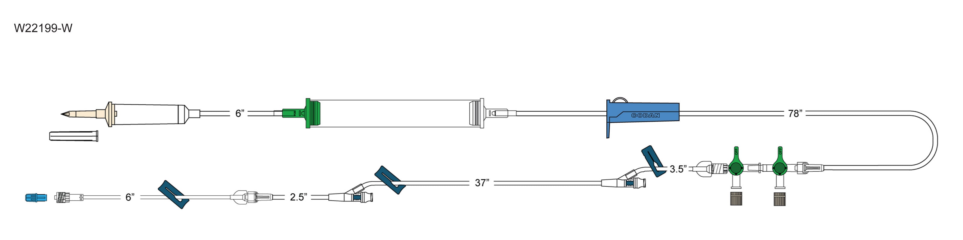 CODAN 10d non-vented chamber, cylinder hand pump, roller clamp, detachable 2-gang four-way stopcocks, (3) slide clamps, (2) needlefree Y-sites, 6” pigtail with spin-lock