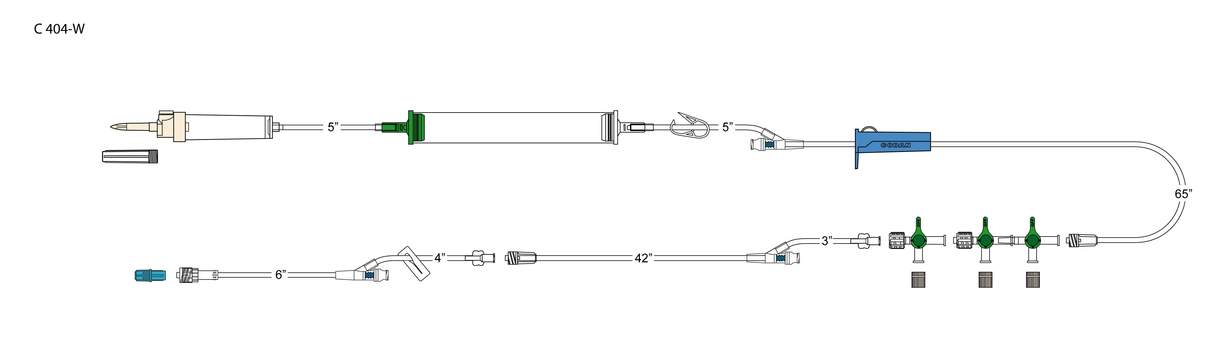 CODAN 10d vented chamber, cylinder hand pump, pinch clamp, needlefree Y-site, roller clamp, 2-gang four-way stopcock manifold, detachable four-way stopcock extension, (2) slide clamps, detachable four-way stopcock, 5” microbore pig