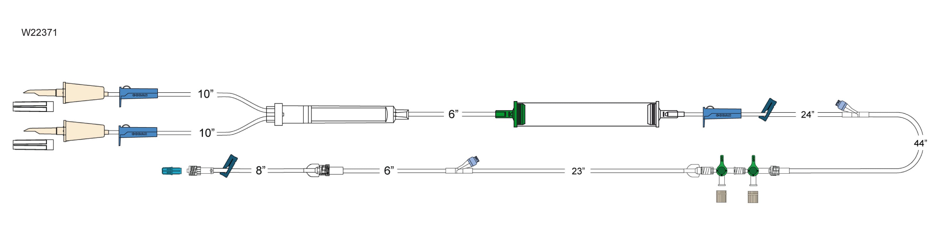 CODAN (2) non-vented spikes, (3) roller clamps, 200 micron filter chamber, cylinder hand pump, (2) needlefree Y-sites, 2-gang detachable four-way stopcocks, 8” pigtail with spin-lock