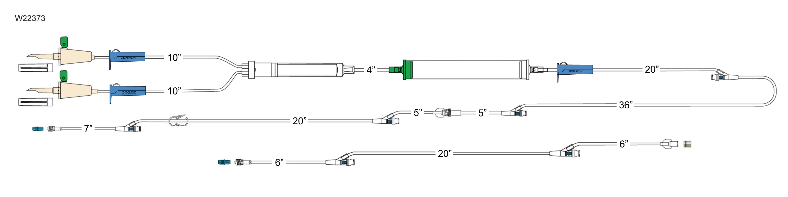 CODAN (2) vented spikes, (3) roller clamps, 200 micron filter chamber, cylinder hand pump, slide clamp, detachable 2-gang four-way stopcock, male luer-lock