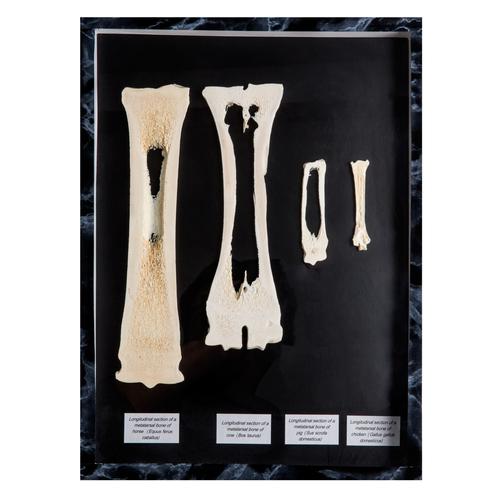 Includes four longitudinal sections of the following mammal metatarsal bones: Horse, Cow, Pig, and Chicken. The longitudinal section makes it possible to clearly explain the stability of the bones and to allow conclusions about the animal's locomotion.