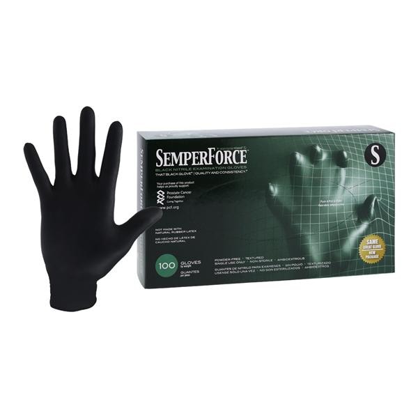 Specification Brand SemperForce Chemo Status Not Chemo Approved Chlorinated Chlorinated Color Black Cuff Style Beaded Disposable/Reusable Single Use Finger Thickness 4 Mil Glove Exterior Textured Fingertips Hand Compatibility Ambidextrous Item Gloves Item Type Exam Material Nitrile Palm Thickness 3.2 Mil Quantity 100/Box Size (Text) Small Sterile/Non-Sterile Non-Sterile