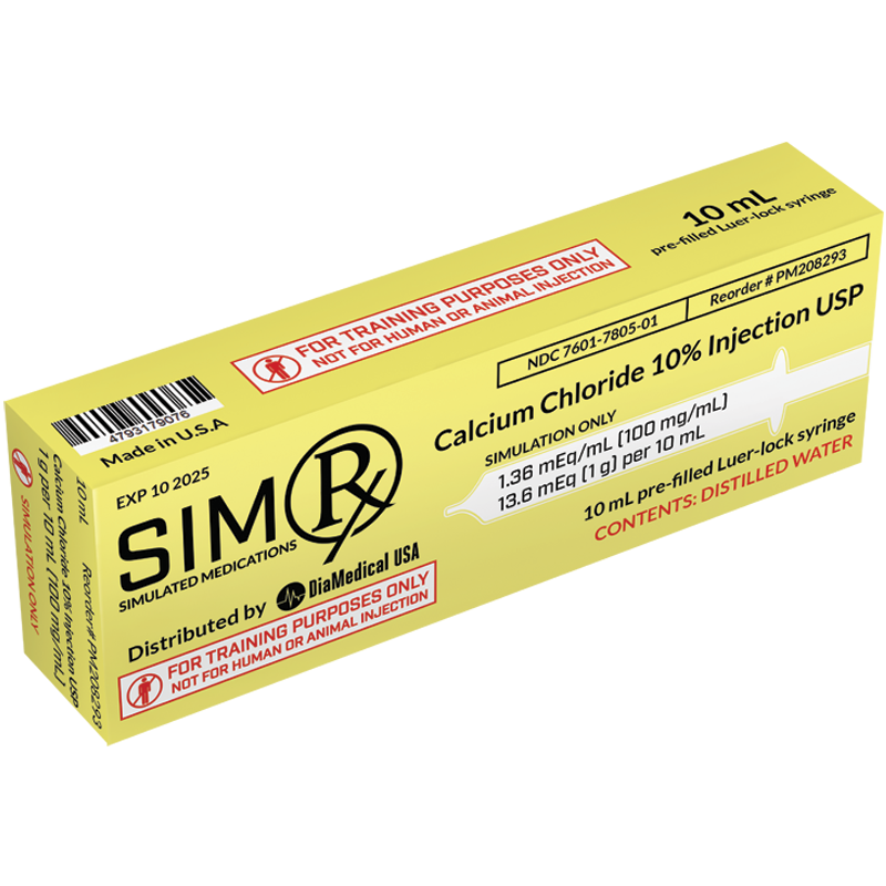 SimRx Code Medications provide instructors with the opportunity to teach the proper administration of Calcium Chloride to treat and prevent cardiac arrhythmias.