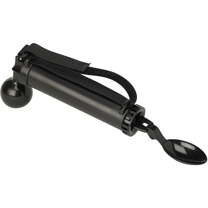 To prevent spillage, the counter weights within the spoon keep the spoon bowl level no matter the arm position or level of tremor. The user does not need a strong grasp on the spoon because of the hook & loop strap connected to the built-up handle. For children with PDD and SI problems, the spoon's weight gives added proprioceptive input.