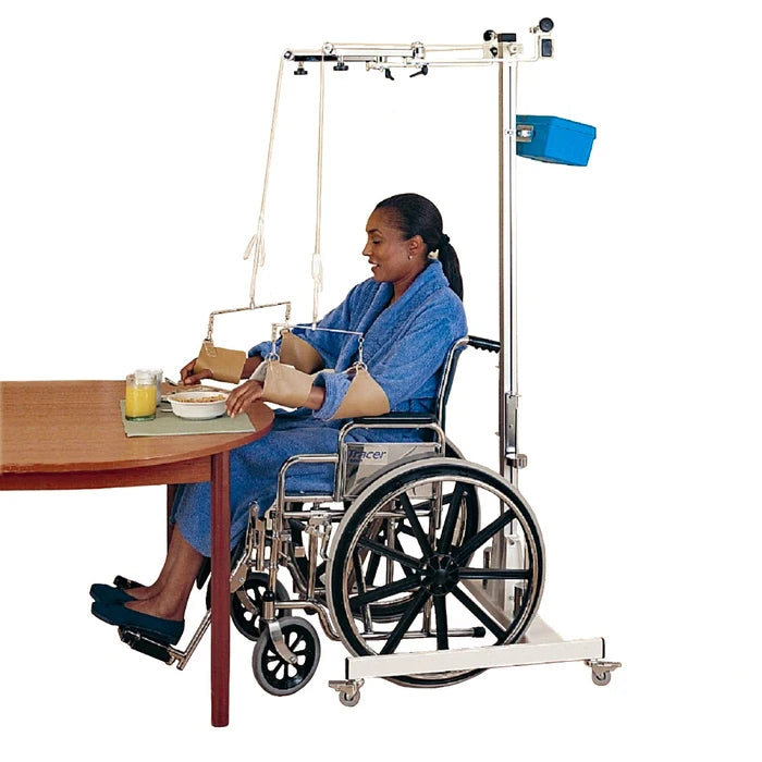 The Swedish Help are is a counterbalanced arm sling that support the arm and provides functional assistance and muscle re-education for clients with impairment of paresis of shoulder muscles, cervical spine injuries, hemiplegia, multiple sclerosis or some forms of rheumatoid arthritis. The arm is also great for assistive support for training in ADL or as a passive support for typing or computer work. Adjustable arms allow for internal and external shoulder rotation. The amount of arm swing can be restricted for elbow flexion and extension. It's gliding cord track lets clients move arms with ease. It can be used from a supine, or sitting position. The Swedish help arm includes: seven pairs of slings for wrists and elbows, twenty 1-oz. weights, eight 1-lb. weights, plastic storage case for accessories, and a wrench for assembly and adjustment.