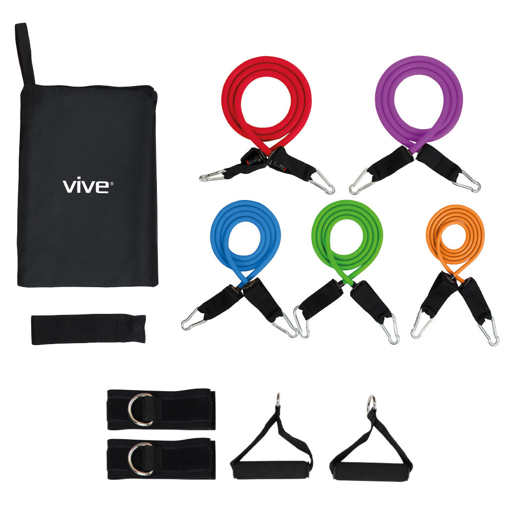 Includes five-tube resistance bands, two handles, two ankle straps, one door anchor, and a convenient storage bag